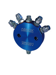 The simple way to feed fluids to more than one dispensing device (up to 5). This manifold may be used to ensure optimal supply e.g. to 5 metering valves. Idle outlets are safely sealed by 4 screw plugs (included in delivery). Further, 2 attachment screws (M8x16, incl. wedge) are included, to fix the manifold to the ABNOX grease supply drum pump (distance btw. screws 70 mm). |